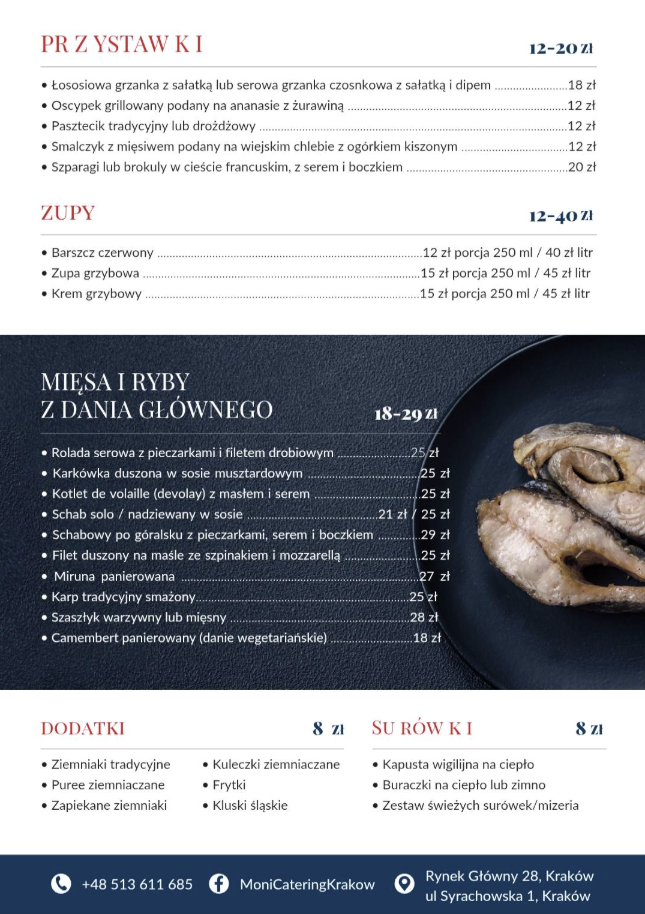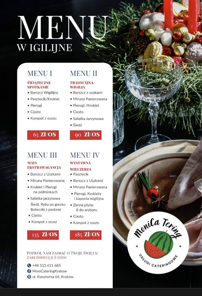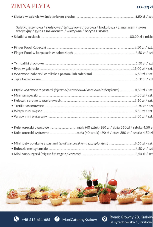 Monicatering Kraków to firma cateringowa oferująca usługi cateringowe w Krakowie dla klientów indywidualnych i firm. Realizujemy catering weselny, na chrzciny, komunie, urodziny, imprezy firmowe, szkolenia, konferencje i spotkania okolicznościowe. Zapewniamy obsługę przyjęć, świeże posiłki wysokiej jakości, catering konferencyjny i dostawy na terenie Krakowa. Nasza sala bankietowa idealnie sprawdza się na różnego rodzaju wydarzenia rodzinne i firmowe. Wypożyczamy stoły, krzesła, obrusy, dekoracje, naczynia oraz sprzęt gastronomiczny. Świadczymy usługi na wysokim poziomie, dbając o walory smakowe, estetykę i profesjonalną obsługę. Obsługujemy miejsca pracy osób, spotkania, eventy i imprezy okolicznościowe. Wybierz najlepszy catering Kraków !